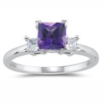 This contemporary Three Stone Amethyst Ring exhibits an AAA quality princess-cut Amethyst, crafted with two elite princess-cut Diamonds prong set in 14K White Gold. Approximate Gemstone Weight: 0.89 Carats. Approximate Diamond Weight: 0.20 Carats This product is sold by JEWELS BY SABRINA.,SHAPE:Princess,SHAPE:Princess,METAL:14K Gold,RHODIUM:Yes,SETTING STYLE:Prong Setting,SETTING STYLE:Prong Setting,MINIMUM CARAT TOTAL WEIGHT:0.2,MINIMUM CARAT TOTAL WEIGHT:0.89,MINIMUM COLOR:H,MINIMUM CLARITY:SI,GEMSTONE DIMENSIONS:6 mm,GEMSTONE:Amethyst,COLOR:Purple,ACTUAL METAL:14K White Gold,NUMBER OF DIAMONDS:2,AVERAGE COLOR:Purple,AVERAGE QUALITY:AAA,NUMBER OF STONES:1